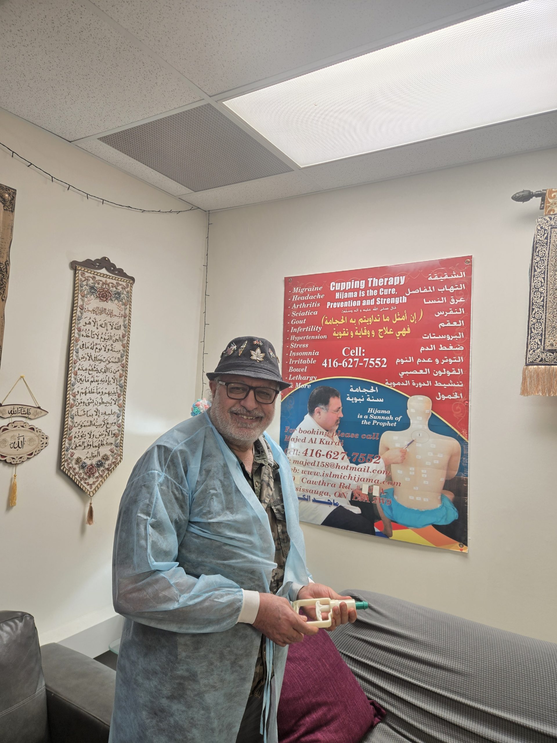 وبدأت المسيرة الجديدة: نعم إنخرطنا في الحياة في كندا وإفتتحت عيادة للحجامة الإسلامية في مدينة ميساساجا وبتصريح رسمي وبتوفيق من الله سبحانه وتعالى حصلنا على تصريح من وزارة الصحة الكندية وكما قالوا لي إنني أول من يحصل على هذا المسمى والتصريح أقصد الحجامة الإسلامية والحمدلله رب العالمين ثم أضفنا لها التداوي بالزيوت العطرية والروائح وأصبح الآن لدينا في العيادة ماكينة تستخرج زيت حبة البركة زيت نقي مائة بالمائة.